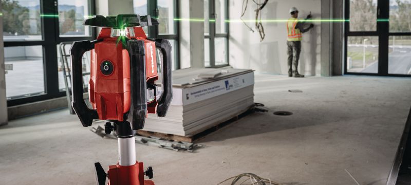 Tugev, väga nähtava rohelise kiirega ja automaatsete funktsioonidega sisetingimustesse mõeldud pöördlaser-lood nivelleerimiseks, joondamiseks, kallete mõõdistamiseks ja ruutudeks jagamiseks (Nuron platvorm)